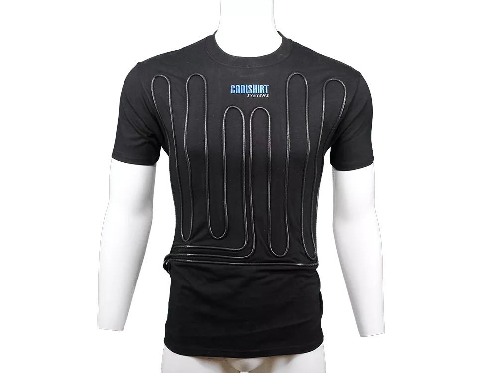 The COOLSHIRT® contains approximately 50 feet of medical grade capillary tubing securely stitched on the front and back of the shirt. It is connected to a compact cooling unit via insulated hose